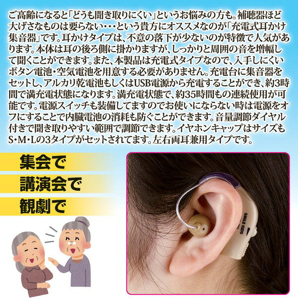 充電式 耳かけ集音器 【左右両耳対応】 耳かけタイプ 音量調整ダイヤル付き■サイズ・色違い・関連商品■耳すっぽり集音器/充電式■耳かけ集音器/充電式[当ページ]■耳かけ集音器関連商品の検索結果一覧はこちら■商品内容ご高齢になると「どうも聞き取りにくい」というお悩みの方も。