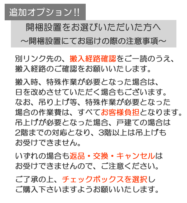 オプション(追加料金有)で開梱設置でのお届けも選択していただけます。