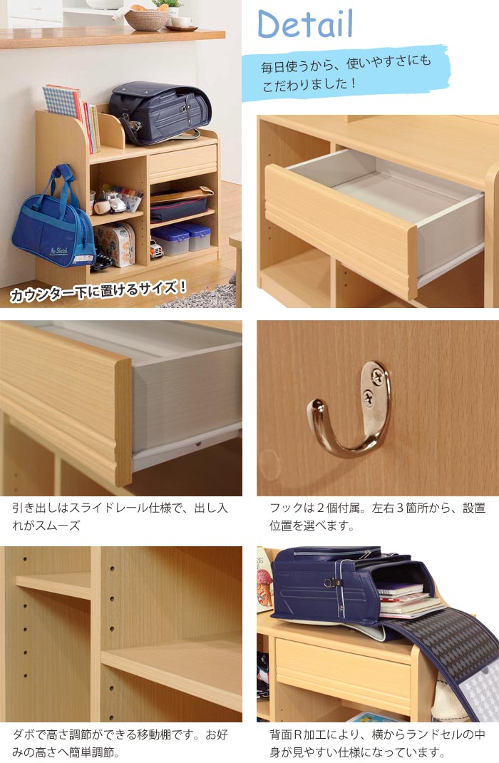 リビングに置いても空間に馴染むナチュラルなデザインで、ご家族の目に届くと ころに置けるのも嬉しいですね! 色々な大きさの物の収納面に加え、背面にR加工を施してランドセルの中身が 見やすい仕様になっています。