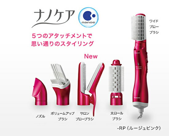[パナソニック くるくるドライヤー ナノケア] EH-KN99-RP EH-KN89-PN EH-KN79-W 型番 EH-KN99 EH-KN89 EH-KN79 カラー ルージュピンク ピンクゴールド 白 マイナスイオン ○ ○ ○ ナノイーイオンチャージ ○ ○ ○ 付属ブラシ ワイドブローブラシ サロンブローブラシ 太ロールブラシ ボリュームアップブラシ ノズル ワイドブローブラシ サロンブローブラシ 太ロールブラシ ワイドブローブラシ パナソニック くるくるドライヤー ナノケア の詳細 商品名 パナソニック くるくるドライヤー ナノケア EH-KN99-RP サイズ 長さ34.0×最大径6.9cm(ワイドブローブラシ装着時) 仕様 【電源方式】交流式 【電源】AC100V 50-60Hz 【消費電力】650W(ドライ/温風時) 【電源コード長さ】約1.7m 【質量】約375g(ワイドブローブラシ装着時) 【機能】「ナノイー」、「ナノイー」イオンチャージ、クールショット 生産国 タイ製 付属品 ワイドブローブラシ, 太ロールブラシ, サロンブローブラシ, ボリュームアップブラシ, ノズル メーカー パナソニック株式会社 区分 美容家電、ヘアドライヤー 保証期間 1年間 JAN 4549077934178 パナソニック くるくるドライヤー ナノケア EH-KN99-RP サロンブローブラシ、美容室のブローのような仕上がり 「ナノイー」でしっとりまとまりのある髪へ Panasonicのナノイーくるくるドライヤー、 微細なナノイーが髪に浸透し、髪と地肌をいたわりながら美しくスタイリング。