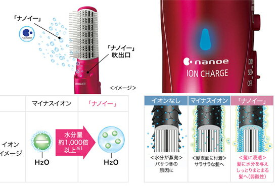 マイナスイオンは髪の表面に付着してサラサラな髪に導きますが、「ナノイー」は髪に浸透して、水分を与え、しっとりまとまる髪に仕上げます。