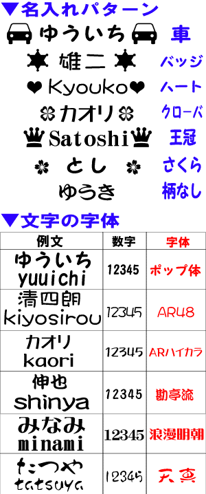 オリジナルメッセージ ご注文方法 1: 7種類の文字入れパターンと字体(フォント)・文字の色を選択 ⇒「買い物かごに入れる」 2: 「注文画面に進む」 3: 「簡単注文画面STEP1」 (注文者情報入力) 必要事項をご入力ください 4: 「簡単注文画面STEP3」 (お支払い方法・配送方法選択) 画面下のほうに「文字入れ内容記入欄」がございます そちらに文字入れ内容をご記入ください。